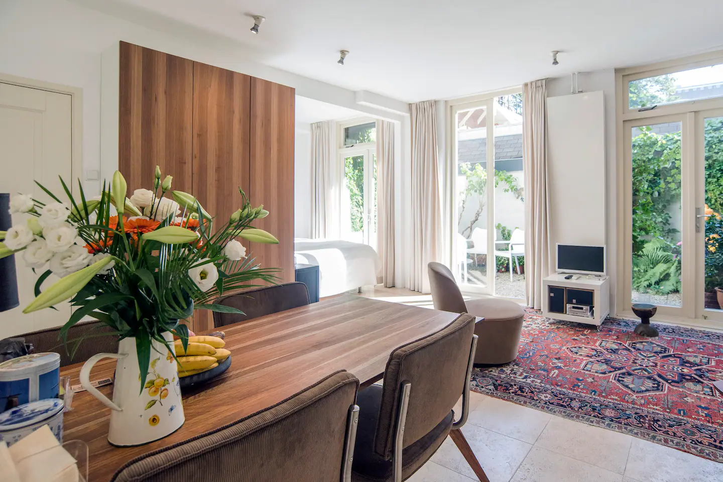 This is a very privat ground floor studioapartment( so no steep stairs) with your own privatgarden , in the peaceful so called backhouse of our canalhouse at the Amstel river. extremely central yet very quiet. A privat marble bathroom/ toillet, privat kitchen+ privat (Miele) washingmachine / dryer(etc.).2 minutes away from Central Station( subway), 9 minutes from World Trade center(subway). The subway entrance is 2 minutes